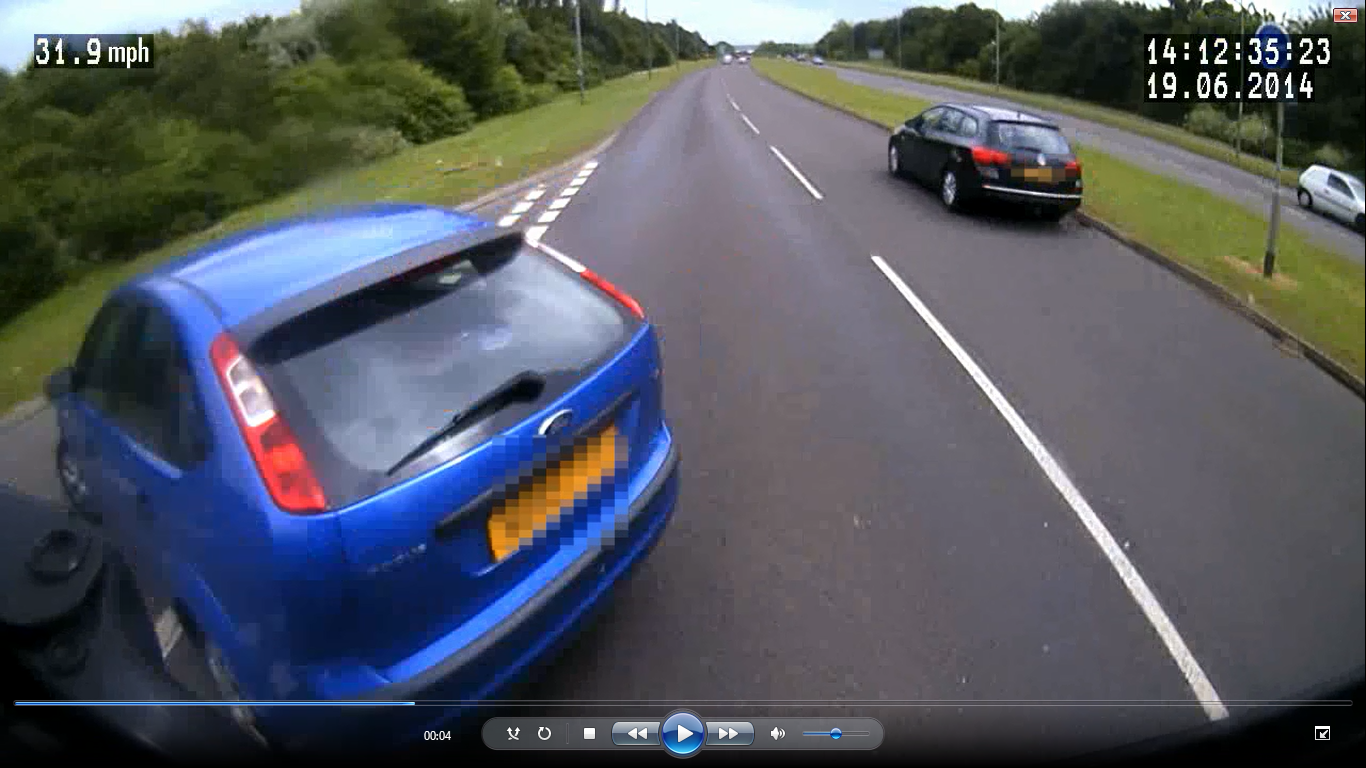 A car was just seconds from disaster when it dangerously cut in front of a heavy goods vehicle (HGV) on the A4146, near Milton Keynes Village in Buckinghamshire. A 3G camera from Intelligent Telematics captured the exact moment when the driver of the Ford Focus recklessly attempts to make an illegal left turn from the outside lane of the road down the wrong way of a slip lane, missing the commercial vehicle by a matter of centimetres.