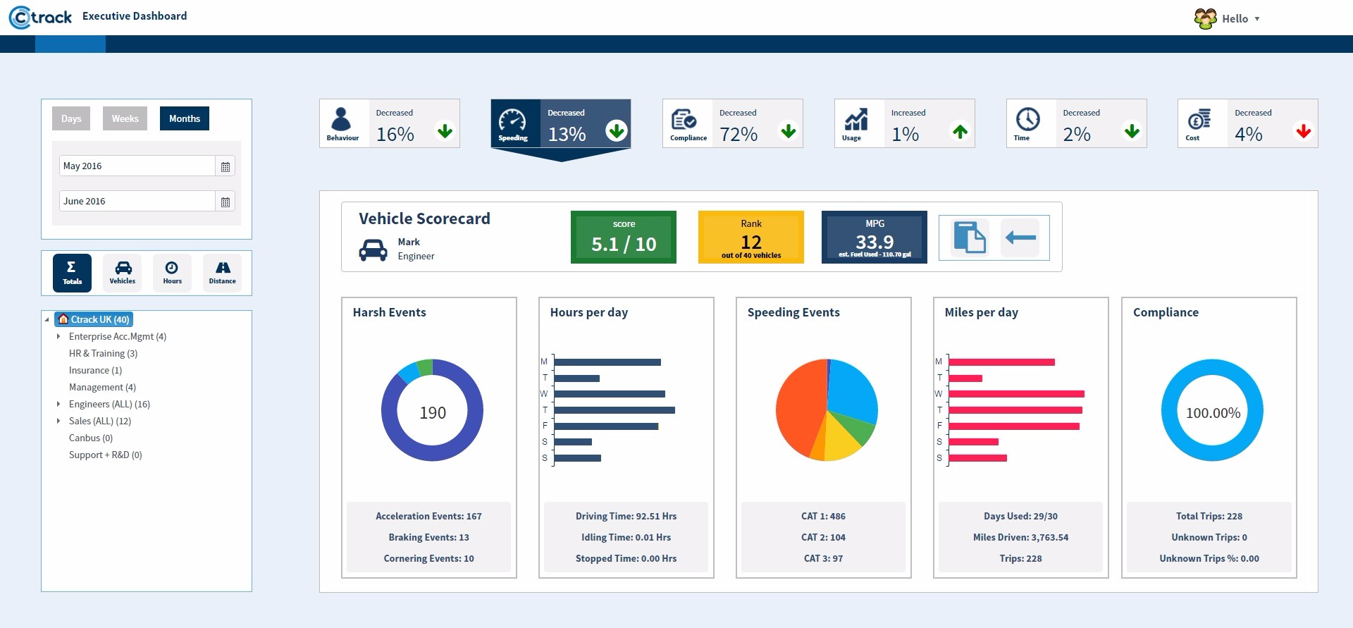 The Executive Dashboard has been designed to support small fleets as well the largest enterprises with the capability to display whole fleet data with drill down through division, region or branch to individual vehicle or driver. It can be configured to reflect the organisational structure of any business and there is no limit to the number cost centres or organisational hierarchies.