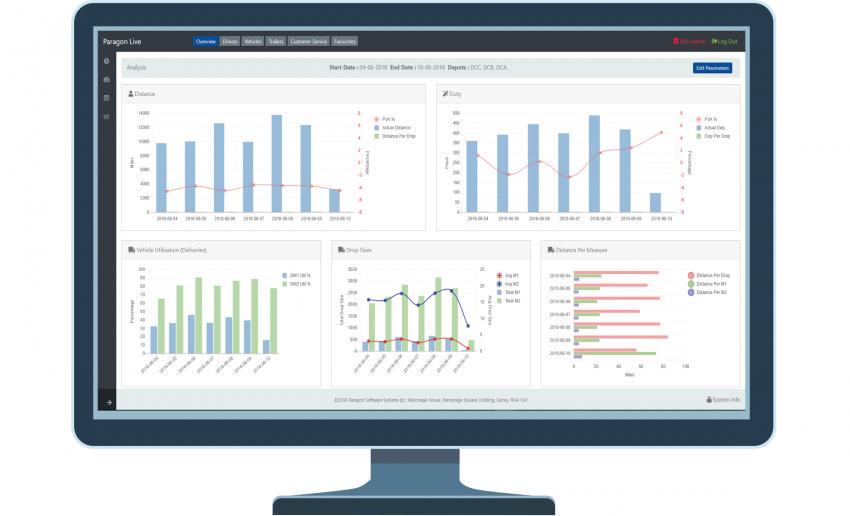 The new Analysis component allows Paragon’s customers to gain a greater understanding of what is happening within their operations, via a wide range of transport-related metrics – including vehicle usage, planned versus actual comparisons, distance per drop and on-time performance. Interactive business intelligence charts that collate these factors can be accessed online in order to review the performance of a single site or multiple locations.